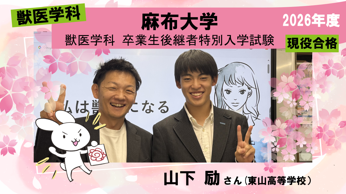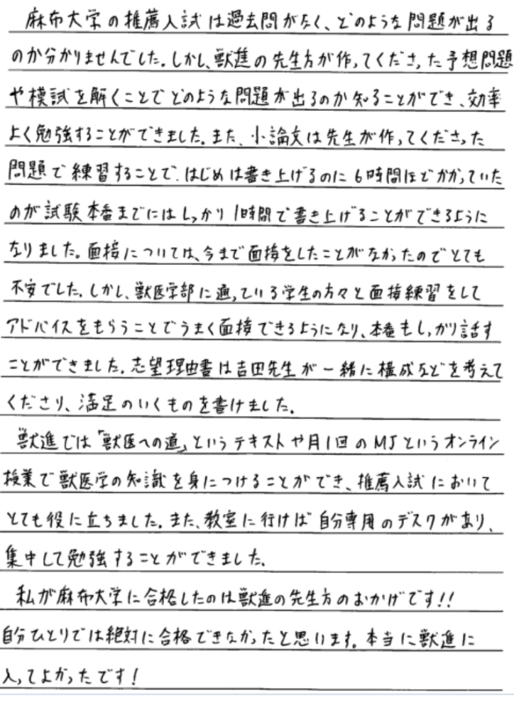 獣医師を目指そうと決め、入試について調べていくと、麻布大学には後継者推薦入試があることを知りました。試験を受けられる機会を増やすため、後継者推薦入試を受験しようと決め、対策の予備校を調べました。獣進は予備校の中でも自宅に近いことが選んだ理由です。