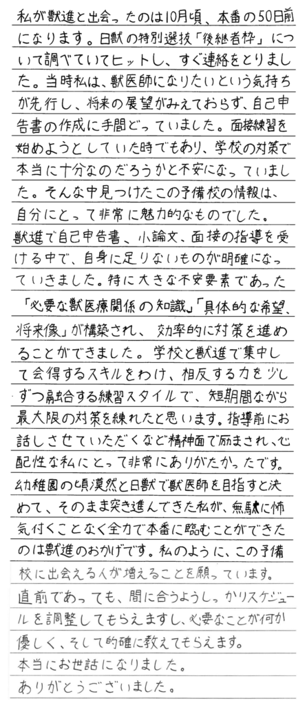 両親が日本獣医生命科学大学の後継者推薦を対策してくれる塾を探してくれて、9月の下旬に獣進のHPを見つけ、試験も11月中旬だったことから、10月に入塾のための面談を受けてすぐに入塾しました。推薦パックを受講し、志望理由書の授業と小論文対策、面接練習を受けました。