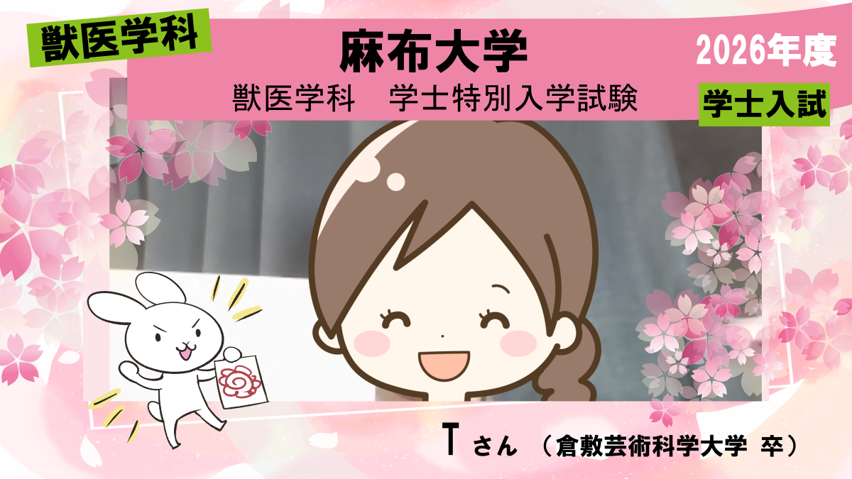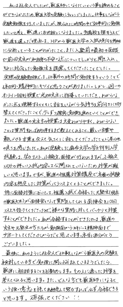 獣医系大学の入試についてとても分析しているところです。それらの分析が指導に反映されていると感じました。また、私は働きながらの受験勉強だったため、学習しづらい状況にもかかわらず、働きながら受験勉強を行う勉強法や計画を提案してくれました。学士入試や社会人入試で獣医学科を目指す人に獣進をおすすめしたいです。