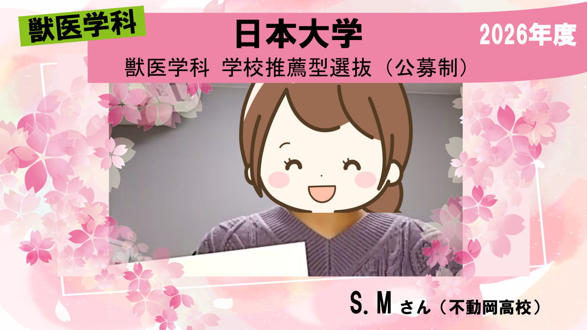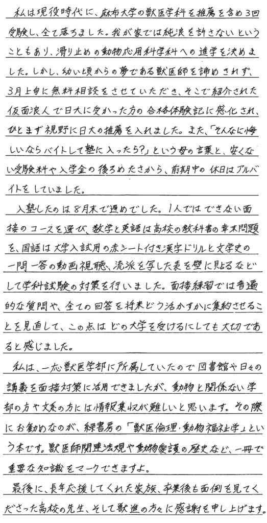 幼稚園の時から獣医師になりたく、周囲の大人たちにも「将来は獣医師になるのね。」と言われながら育ちました。高校選びも、選んだ高校から獣医学科への合格者がいたため進学しました。しかし、現役の時は獣医学科の推薦入試と一般入試2回の計3回を受験しましたが、難しく、合格していた動物応用学科に進学しました。獣医師への気持ちを断ち切れず、獣医学科専門予備校について調べて獣進を見つけ、親と相談し塾代をバイト代で賄うことで獣進の面接練習を受講することにしました。