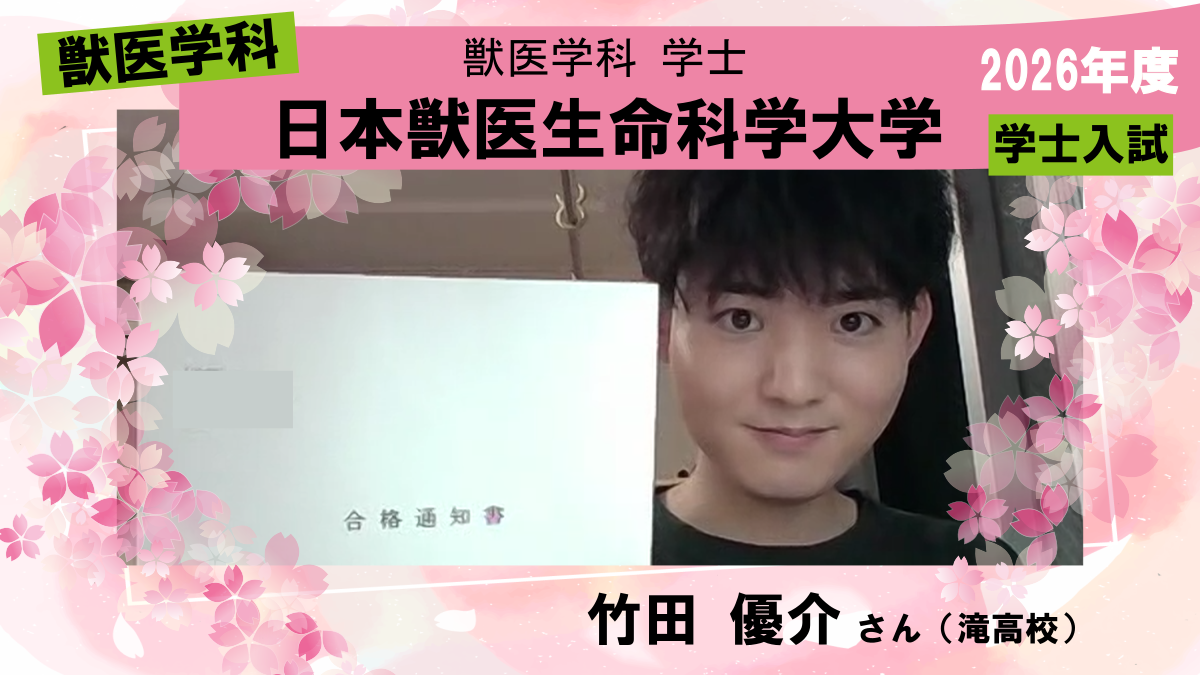 とてもうれしかったです。面接試験では面接官の獣医学科の教授に厳しい一言をいわれ、合格は難しいと考えていました。今回合格した日本獣医生命科学大学は小動物の診療に特化していることや自身の雰囲気と学校の雰囲気が一致しており現役時代からの第一志望校でした。現役時代に推薦入試を受験したのも日本獣医生命科学大学だったので今回の学士入試合格でリベンジが果たせたと共に、私立獣医系大学の最難関に合格できたことがとてもうれしいです。日本獣医生命科学大学の合格通知は郵送できますが、たくさんの書類が同封されるため、封筒が分厚くなり、封筒を開ける前に合格したことを喜ぶことができました。希望の大学に合格して本当にうれしいです。