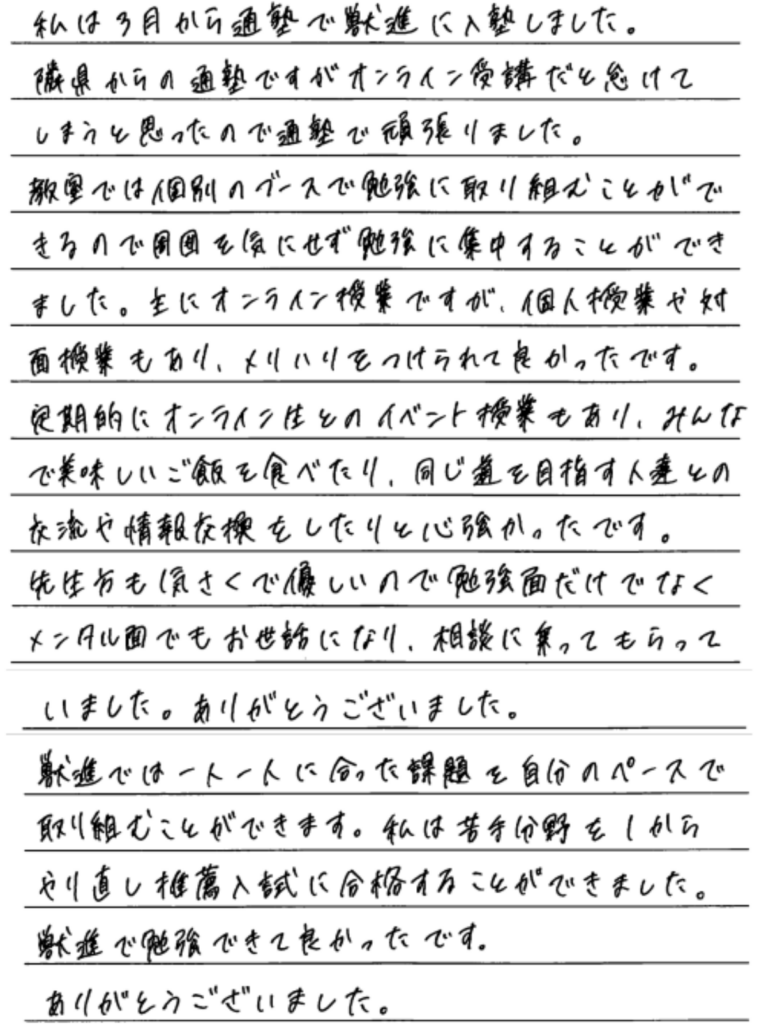 集団塾だと分からないところがあってもどんどん進んでいってしまいますが、獣進では個別指導の時間もあったので、重点的に教えてもらえたり苦手な単元は2周したり、自分に合わせた授業をしてもらえたので良かったです。